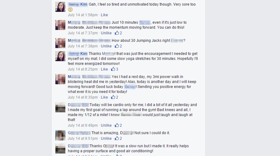 When I started, I hadn’t told anyone that I had started working out again. This was mainly because I had failed so many times that I didn’t want to bother telling anyone anymore. I’m going to start working out felt like a meaningless phrase at that point. Luckily for me, on day 3 one of my friends in a Facebook group announced that she was on day 3 of a diet. So although she wasn’t necessarily a fitness plan, it worked out because she was on the same day as me. Everyday she posted her meals and I posted my workout. Pretty soon other people in our group started joining in and encouraging each other. This was especially helpful on days when I couldn’t muster any enthusiasm to do my workout.