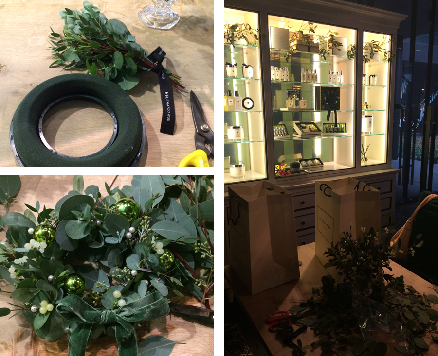 Jo Malone had invited a florist to teach us how to create a Christmas wreath using mistletoe, eucalyptus, pearls, and green ornaments. This was my first time creating an arrangement using a foam oasis, and I loved learning how the different shapes and textures could add a bit of sparkle and dimension! The room was decorated in green and there was a roasted chestnut candle burning on the mantle place. It brought to mind the song Sleigh Ride that goes: At the fireplace while we watch the chestnuts pop. Pop! Pop! Pop!